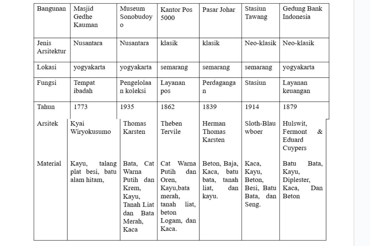 Untuk mengidentifikasi jenis material bangunan pada enam studi kasus dari tiga periode arsitektur (Nusantara, Klasik, dan Neo-klasik), yaitu Masjid Gedhe Kauman Yogyakarta, Museum Sonobudoyo, Kantor Pos Besar Semarang, Pasar Johar Semarang, Stasiun Tawang Semarang, dan Gedung Bank Indonesia Yogyakarta, digunakan metode pengumpulan data sekunder (jurnal, berita, dan analisis gambar).